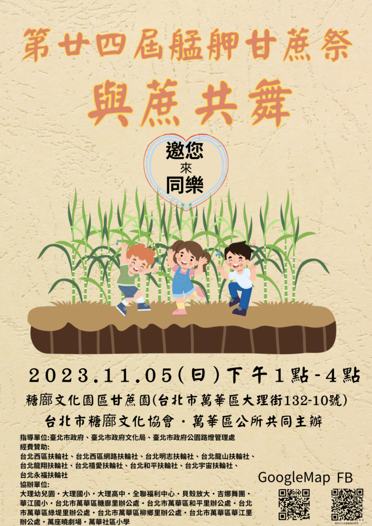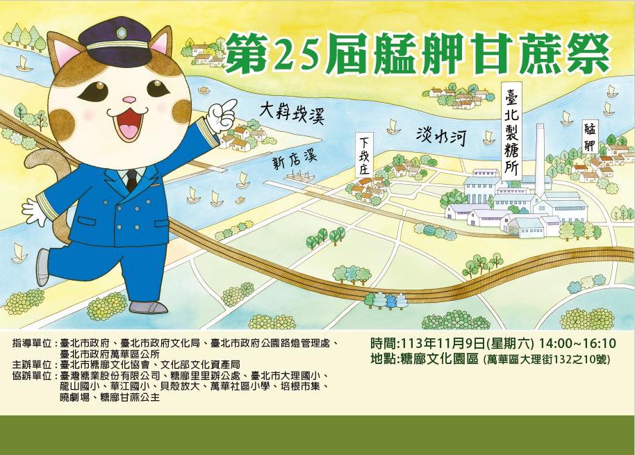 第25屆艋舺甘蔗祭,將於113年11月9日(星期六),在糖廍文化園區舉辦,有精彩的糖廍故事劇展-糖業路徑的𤆬頭人由龍山、華江、大理三所國小和甘蔗公主、陳奎誌同學聯合演出,以客、國、台語呈現,表現在地歷史文化與多元。