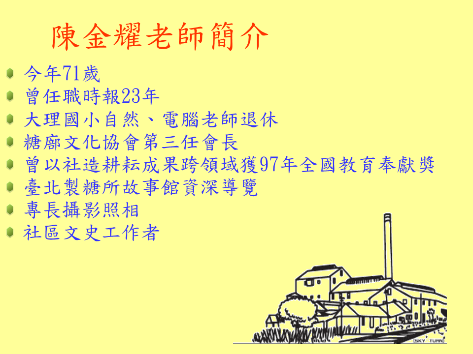 臺北製糖所文化園區 甜甜故事一大理高中篇 報告人: 臺北製糖所故事館資深導覽志工、大理國小退休老師陳金耀